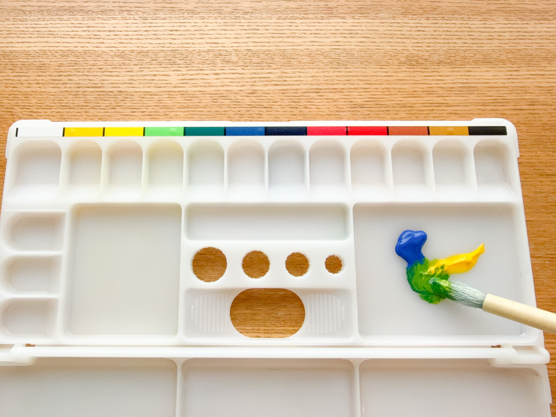 パレットのくぼみに水を一滴たらしてから色を出すと、ふちどまりがやわらぎます。すぐに乾く色は少量ずつ出し、必要に応じて足します。広い面に色を置くときは、下にラップやベーキングシートを敷いておくと、最後にはがせます。道具は、使い終わったそばから水につける小さなカップを用意すると、戻し忘れを防げます。